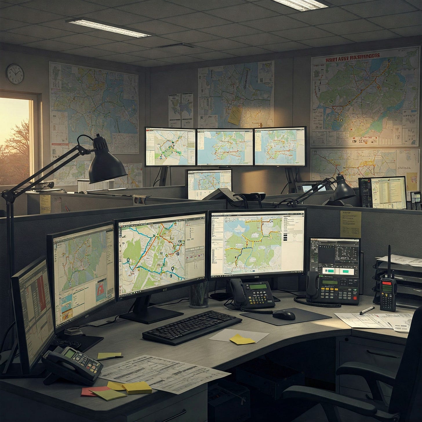 The dispatch office was quiet, the usual daytime cacophony of radios and phone calls replaced by the low hum of computers and the faint glow of monitors. It was late, the kind of late where the day’s tension settles deep in your shoulders. Randy sat at his desk, leaning back slightly in his chair, a look of weary satisfaction finally easing onto his face as he finished logging the last runs.